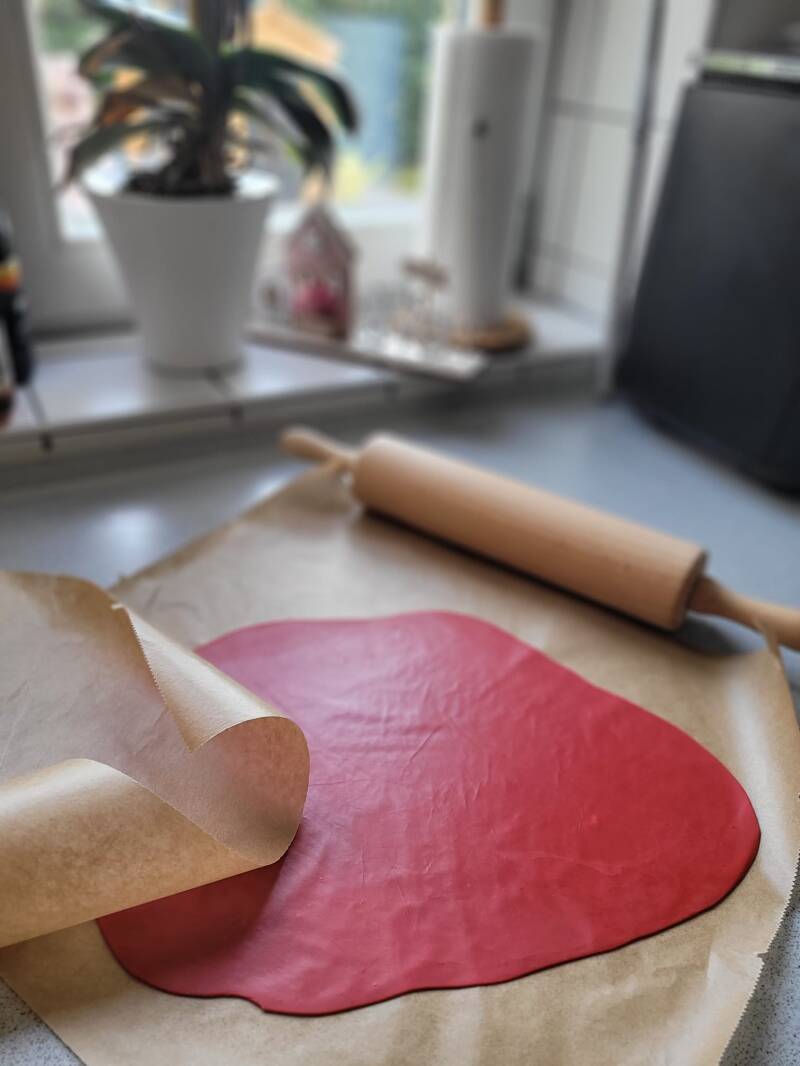 Als nächstes wird der Fondand ausgerollt, wobei er nicht zu dünn werden sollte. Als Richtwert würde ich sagen etwa 3-5 mm dick. Ich habe den Fondand zwischen zwei Blättern Backpapier ausgerollt. Alternativ kann Bäckerstärke verwendet werden, die sich vom sonst klebrigen Fondand wieder entfernen lässt. Normales Mehl hinterlässt unschöne Spuren und die schöne rote Farbe ist nicht mehr so intentiv. Das Backpapier muss zwar öfter mal vom ausgerollten Fondant gelöst werden, damit es nicht zu sehr klebt, aber das Ergebnis lässt sich sehen.